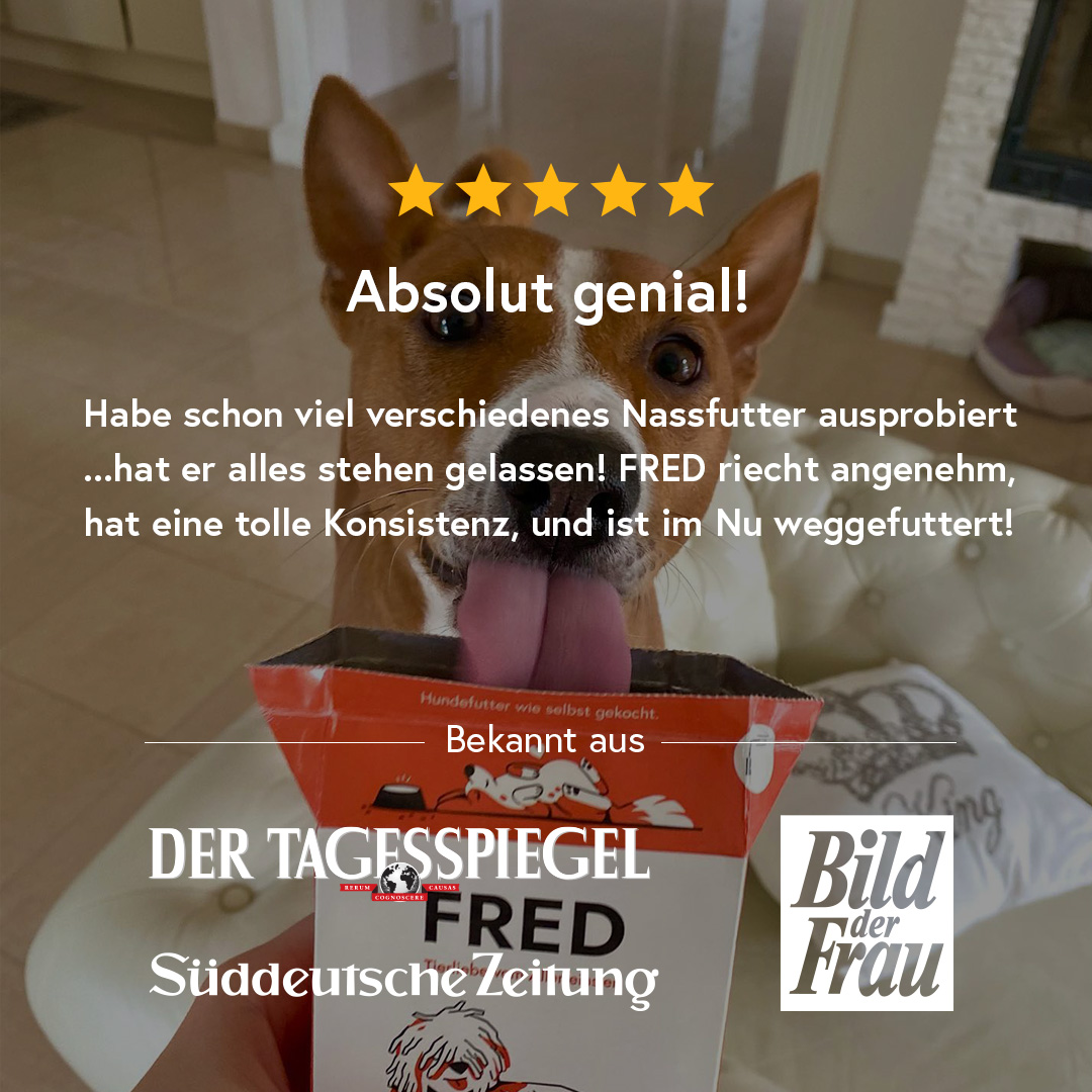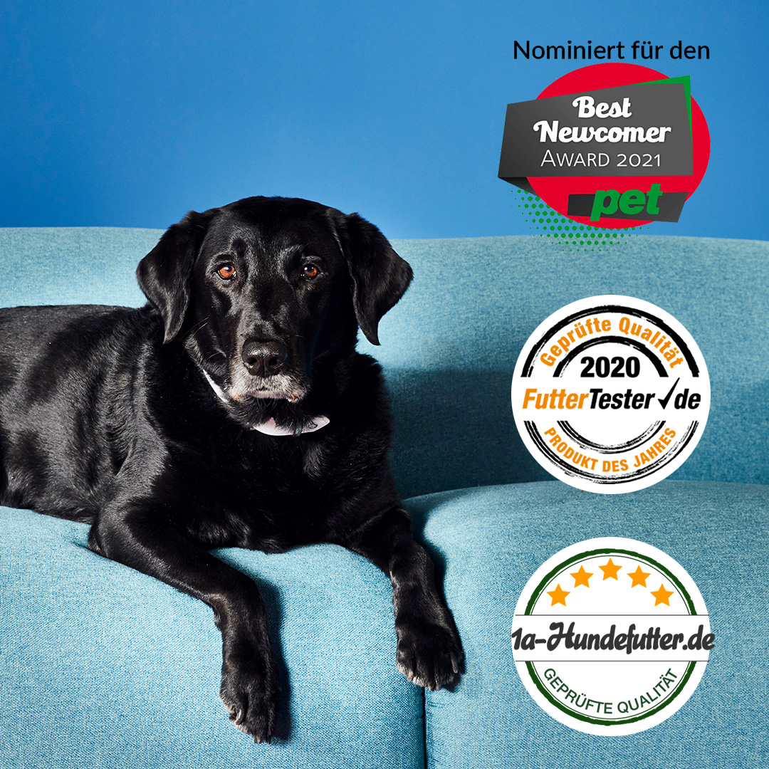 Das FRED Hundefutter wurde bereits mehrfach ausgezeichnet, darunter als "Produkt des Jahres 2020" vom unabhängigen Verbraucherportal FutterTester.de.